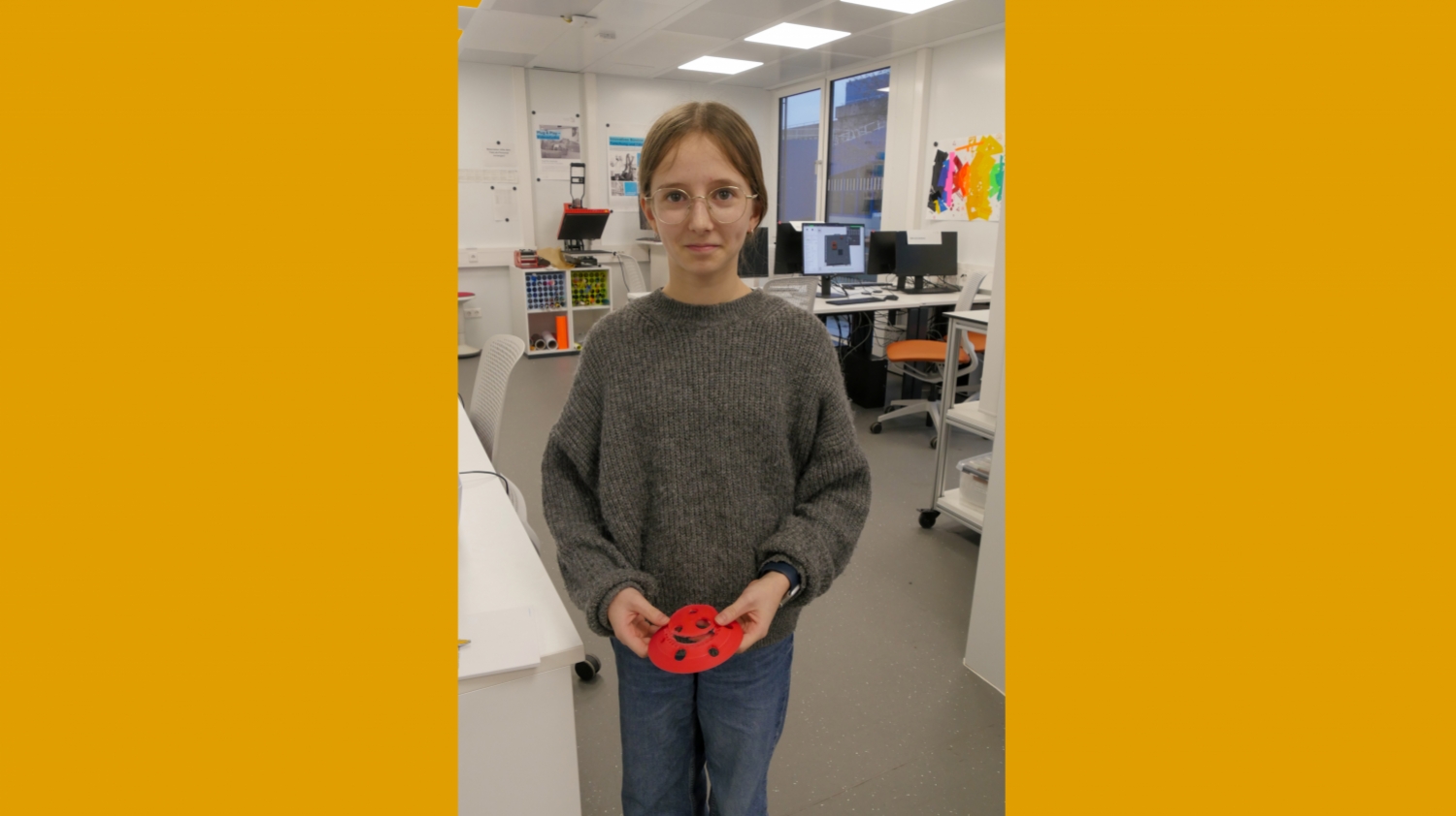 Die Achtklässlerin Amelie Weiland hat genaue Vorstellungen davon, wie ihre Wunschlampe aussehen soll: ein Fliegenpilz, der von innen erstrahlt. Auf einem schmalen Stiel soll dafür ein breiter roter Hut mit vielen Löchern sitzen. Anstelle der weißen Punkte des Vorbilds treten helle Lichtstrahlen. Das Kabel für die Stromzufuhr wird im inneren des Stiels versteckt. Konzentriert arbeitet sie dafür im FabLab der Universität Konstanz am Computerbildschirm und verbessert das digitale 3D-Modell. „Der erste Druckversuch wurde leider nichts. Die Kappe des Hutes ist beim Druckprozess einfach vom Modell gerutscht“, erklärt sie. Nach ein paar Überlegungen zusammen mit ihrem Lehrer hat sie eine Lösung für das Problem gefunden und wenige Minuten später den neuen Entwurf an den 3D-Drucker gesendet. Schicht für Schicht baut dieser nun ein neues Modell aus biobasiertem Kunststoff auf.