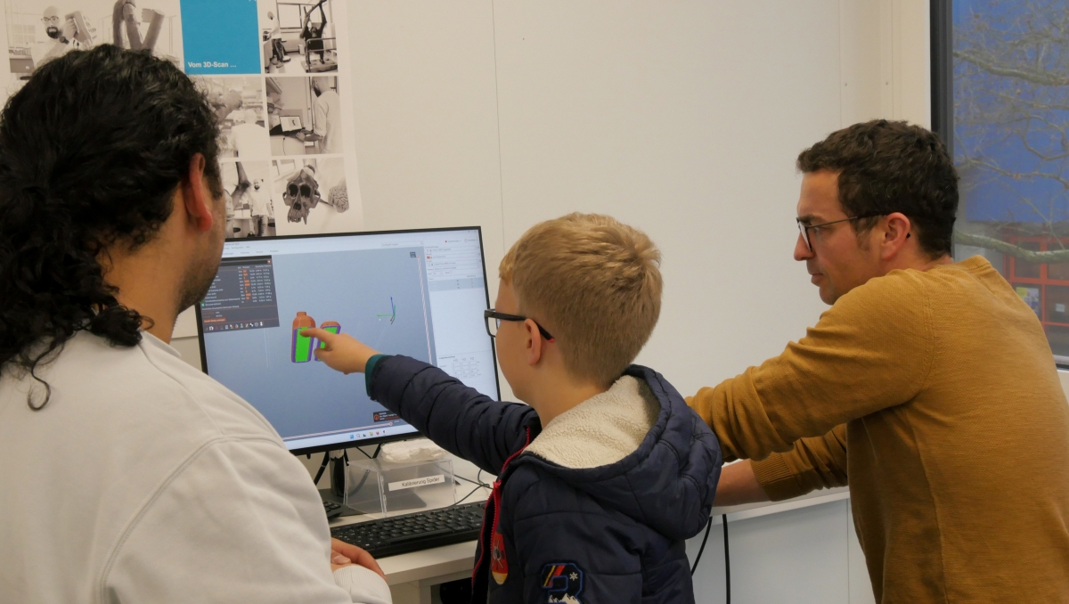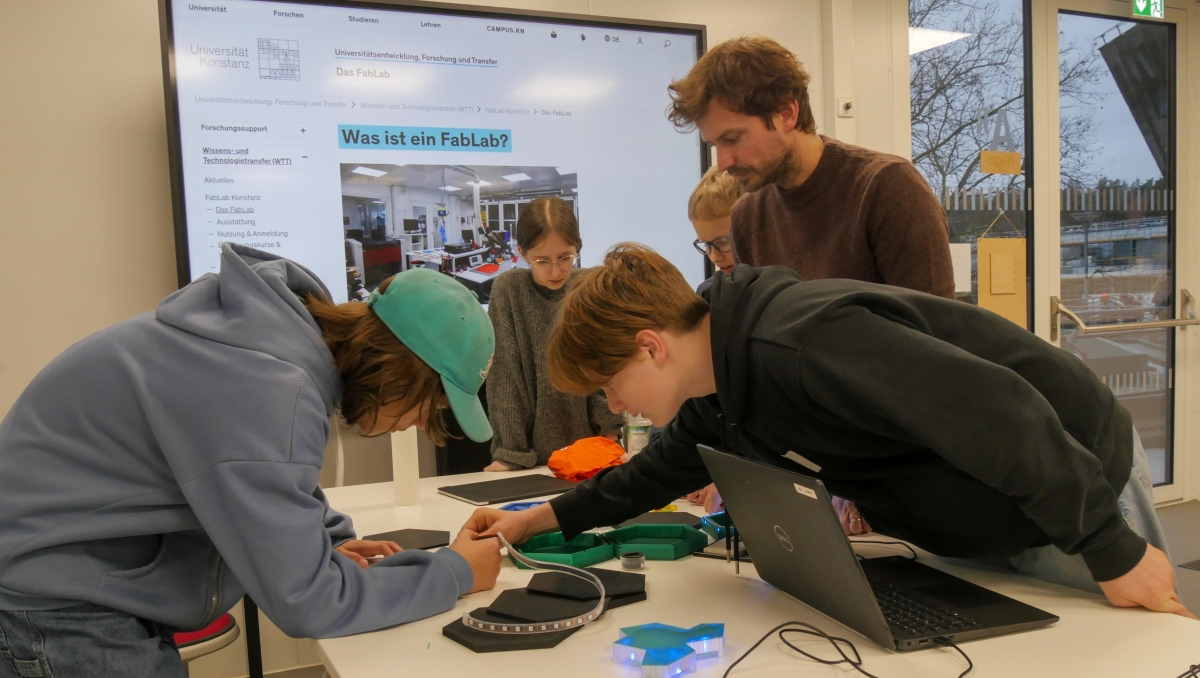 Manuel Bernhardt und die Mitarbeitenden im FabLab unterstützen vor allem bei der praktischen Umsetzung. „Wir zeigen den Schülerinnen und Schülern, wie sie mit den Geräten umgehen und wie sie von der Idee zum realen Objekt kommen“, erklärt Bernhardt. „Im Rahmen ihres Projekts können sie sich dann in ihrer Zeit im FabLab frei aussuchen, woran sie weiterarbeiten wollen. Manchmal müssen noch Modelle am PC verfeinert und ausgedruckt werden, ein anderes Mal wird am Einbau der Leuchtmittel gearbeitet. Oft passiert auch alles parallel, so wie heute.“
