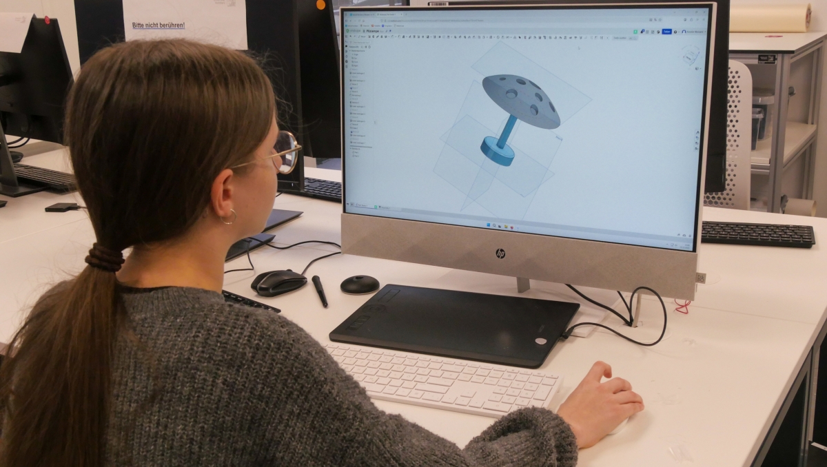 Die Achtklässlerin Amelie Weiland hat genaue Vorstellungen davon, wie ihre Wunschlampe aussehen soll: ein Fliegenpilz, der von innen erstrahlt. Auf einem schmalen Stiel soll dafür ein breiter roter Hut mit vielen Löchern sitzen. Anstelle der weißen Punkte des Vorbilds treten helle Lichtstrahlen. Das Kabel für die Stromzufuhr wird im inneren des Stiels versteckt. Konzentriert arbeitet sie dafür im FabLab der Universität Konstanz am Computerbildschirm und verbessert das digitale 3D-Modell. „Der erste Druckversuch wurde leider nichts. Die Kappe des Hutes ist beim Druckprozess einfach vom Modell gerutscht“, erklärt sie. Nach ein paar Überlegungen zusammen mit ihrem Lehrer hat sie eine Lösung für das Problem gefunden und wenige Minuten später den neuen Entwurf an den 3D-Drucker gesendet. Schicht für Schicht baut dieser nun ein neues Modell aus biobasiertem Kunststoff auf.